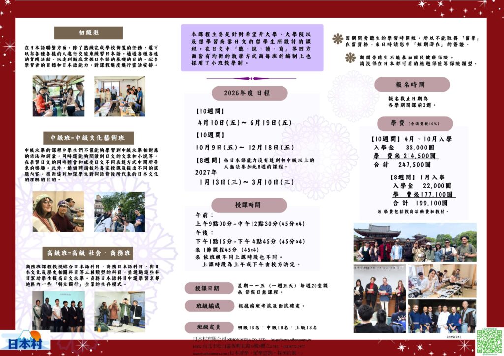 課程依程度分班,包含 初級班、中級班+文化藝術班、高級班+社會商務班,不管你是想從基礎開始穩紮穩打,還是希望一邊提升日語、一邊接觸日本文化、藝術與社會商務主題,都能找到適合自己的學習方向📚🌸