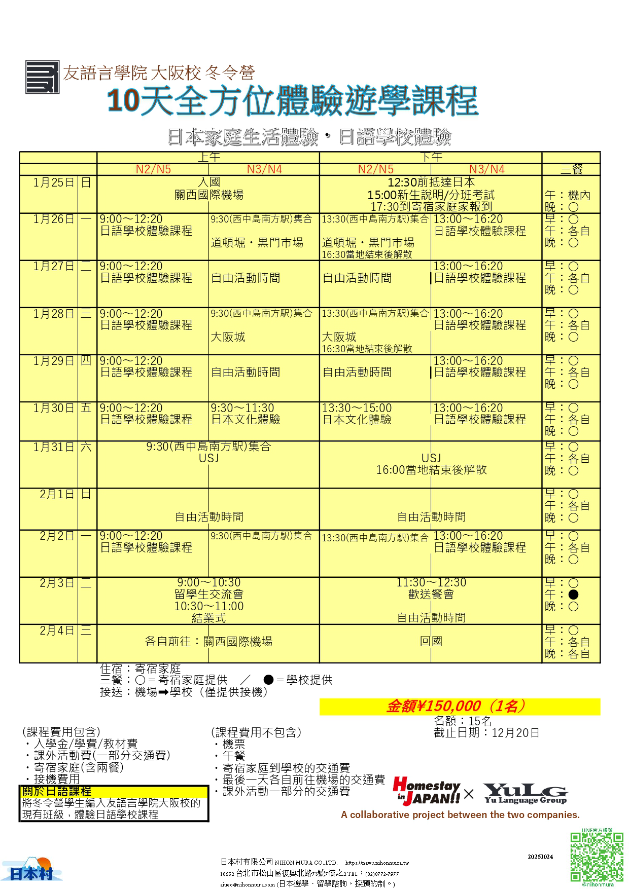 學校資訊已更新為2025年度版了 學校資料可由此處下載。無法下載時,請點選 [洽詢] 聯絡我們。 學校簡介下載 招生概要下載 短期課程下載 報名表格下載 短期課程_報名表格下載 2026冬季遊學下載 2025年行事曆下載 ※學校安排之課程及費用等,若有異動時以學校實際公佈為準※ 〒532-0012 大阪府大阪市淀川区木川東3-1-22+81-6-6309-8051 學校官方網站學校的官網上也可確認資訊。